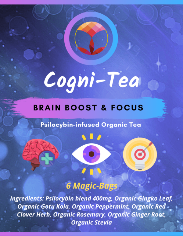 Ingredients: natural Gingko leaf, natural Gotu Kola, natural Peppermint, natural Red Clover herb, natural Rosemary, natural Ginger root, natural Stevia, Psilocybin (four hundred mg).