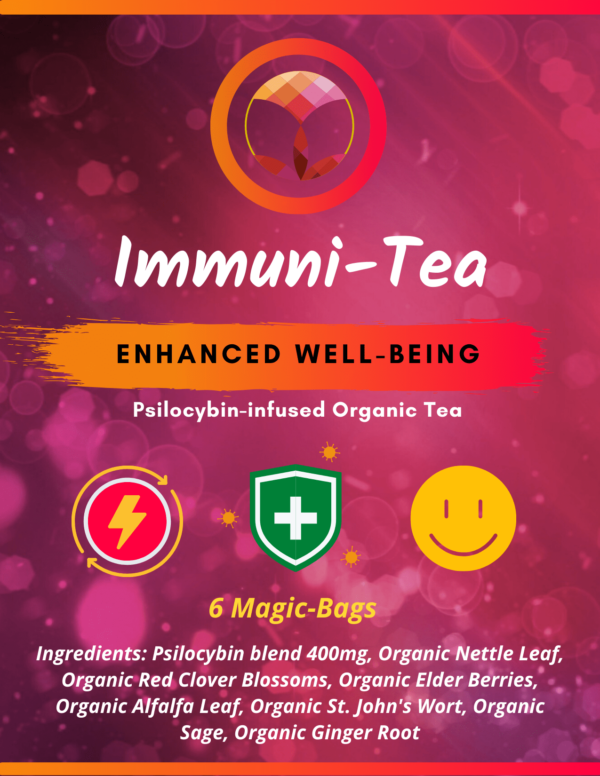 Ingredients: Organic Nettle leaf, natural Red Clover blossoms, natural Elder berries, natural Alfalfa leaf, natural Red Clover herb, natural St. John’s Wort, natural Sage, natural Ginger root, Psilocybin (four hundred mg)